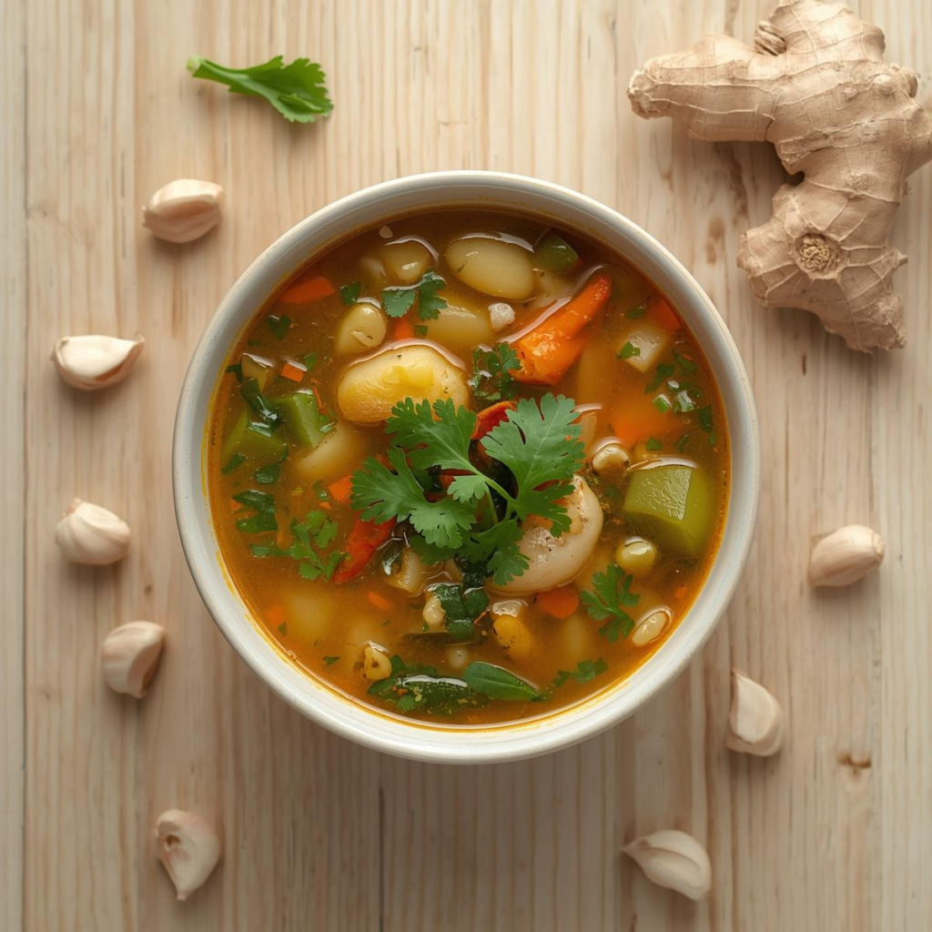 The Garlic Ginger Veg Soup is made with fresh vegetables, garlic, and ginger, creating the perfect immunity boosting meal. This soup naturally strengthens your body, improves gut health, and boosts your energy levels. Rich in antioxidants, this immunity boosting soup helps protect your body from infections.